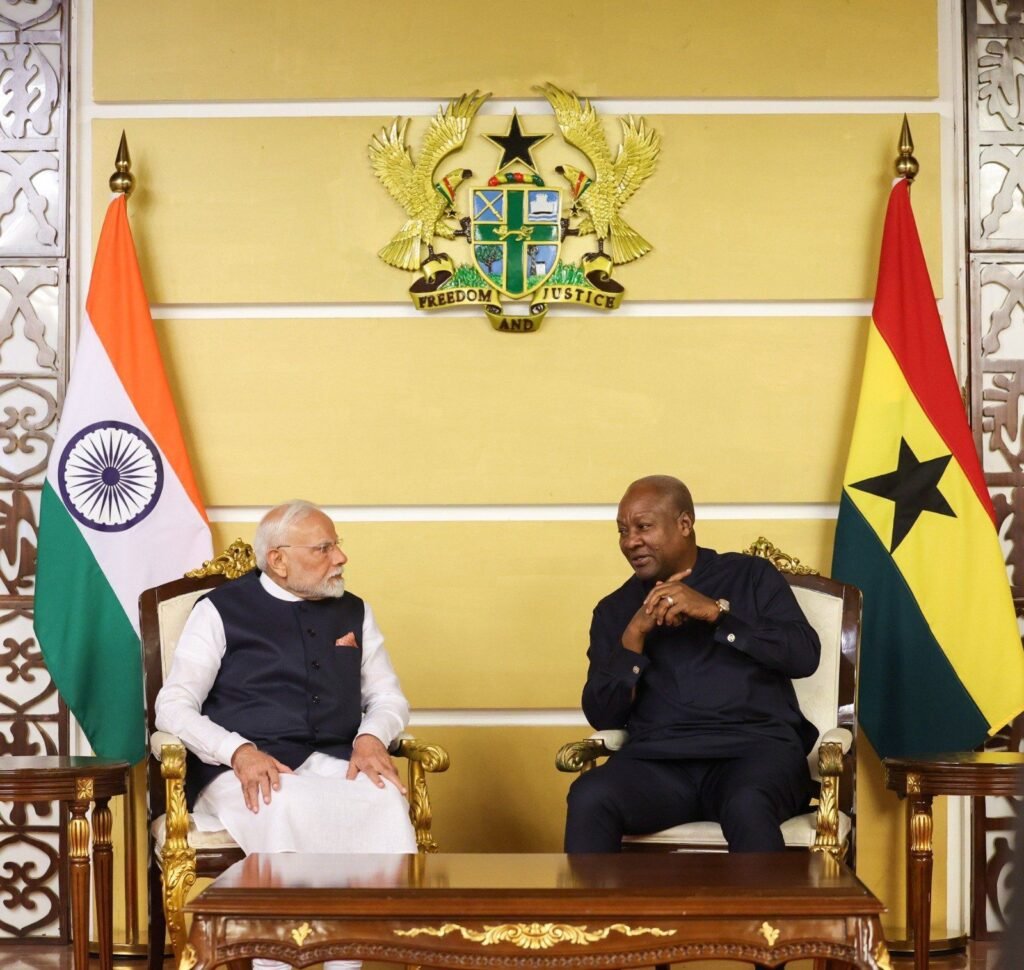During a visit to Ghana, Prime Minister Narendra Modi met with President John Mahama. The two leaders discussed ways to boost trade and strengthen ties between their countries. They signed several agreements (MoUs) to cooperate in areas like energy, agriculture, digital technology, and developing a vaccine hub.